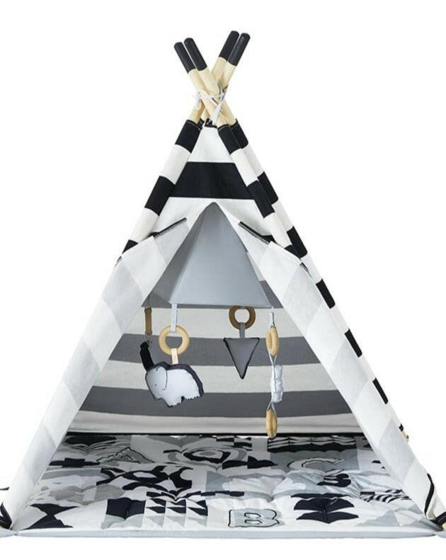 The ABC Baby Activity Teepee is the perfect toy that grows with your baby. They start as a play mat for the tiniest of babies on their backs, and when they learn to roll over, they are enchanted by the graphics of the play mat. Then add the cover and hanging toys, and the curiosity continues as they see their reflection in the acrylic mirror at the base of the hanging mobile. As they get older, remove the toys and the baby has a sheltered place to rest. The ABC Baby Activity Play Tent features a monochromatic design that helps babies learn ABCs and 1,2,3’s. Geometric patterned mat plus-shaped hanging toys help babies to identify shapes at an early age. The wooden ring is safe for teething, and toys easily detach for babies on the go. For use on the floor only. Never leave baby unattended.