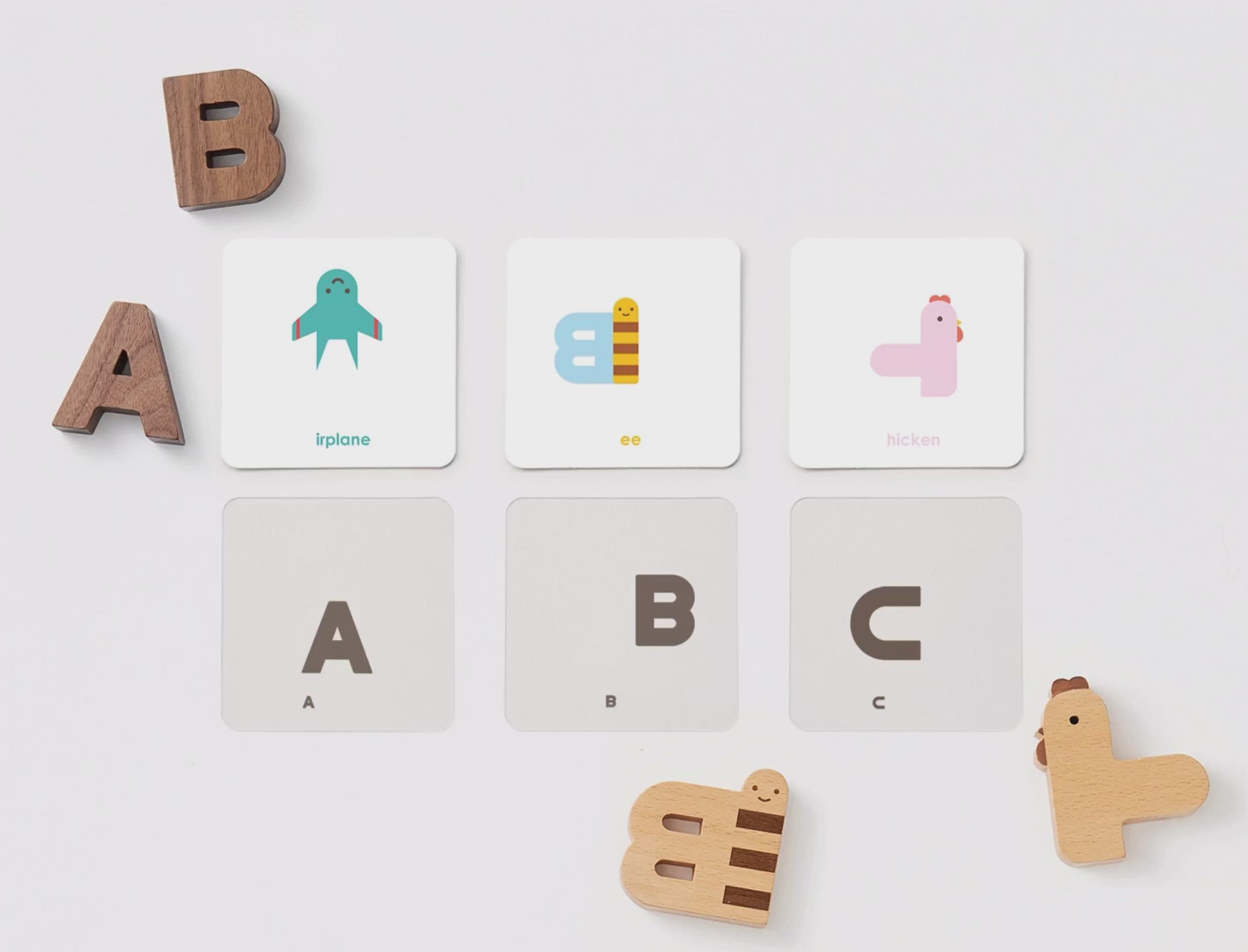 The Oioiooi Alphabet Cards is a set of 26 character cards that can be overlaid by a corresponding letter of the same initial printed on a transparent card. The letters on the transparent tiles, fit snugly into the designs on the card making it a fun game to match the letter with a character.